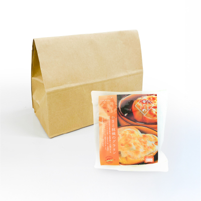かきと林檎のグラタンは、専用袋に入れた後、簡易包装で梱包し、冷凍便で鮮度と美味しさを守ったまま大切にお届けいたします。