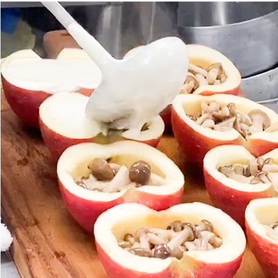 広島の老舗「かなわ」総料理長が考案した特製レシピで仕上げた「かきと林檎のグラタン」。広島産の新鮮な生食用牡蠣を贅沢に使い、くり抜いた林檎にたっぷりと詰め込みました。秘伝のベシャメルソースが牡蠣の旨みと林檎の自然な甘みを包み込み、クリーミーで上品な味わいを引き立てます。