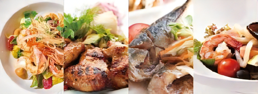 ・鶏肉のグリル、シューマイに醤油とレモンオイルで
